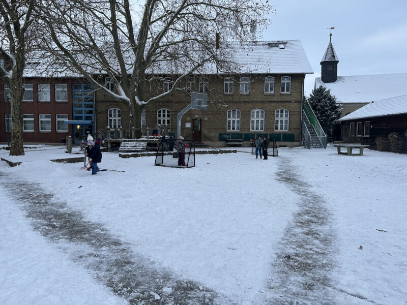 Endlich hat es mal wieder geschneit! Die Kinder kamen morgens schon fröhlich auf den vollgeschneiten Schulhof und begannen gleich mit Besen und Schneeschaufeln größere Schneeberge zu machen. Auch in den Pausen genossen sie den Schnee. Es wurde viel gebaut. Dabei sind auch diese zwei kleinen Schneemänner entstanden.